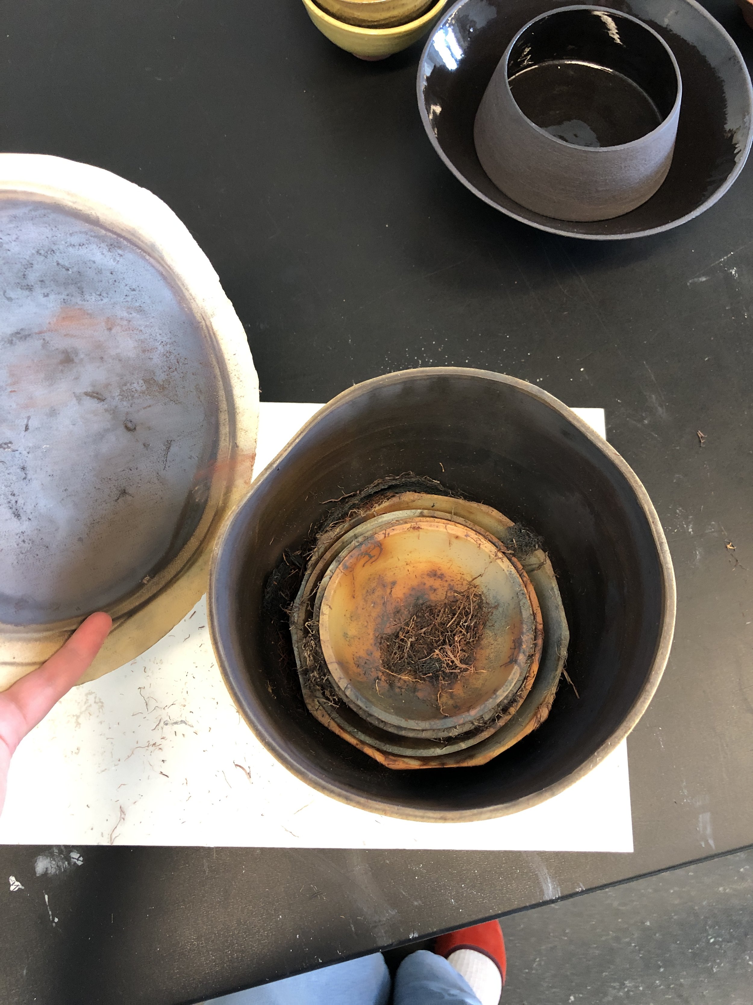 Schaaltje vers uit de saggar met organisch materiaal er nog op