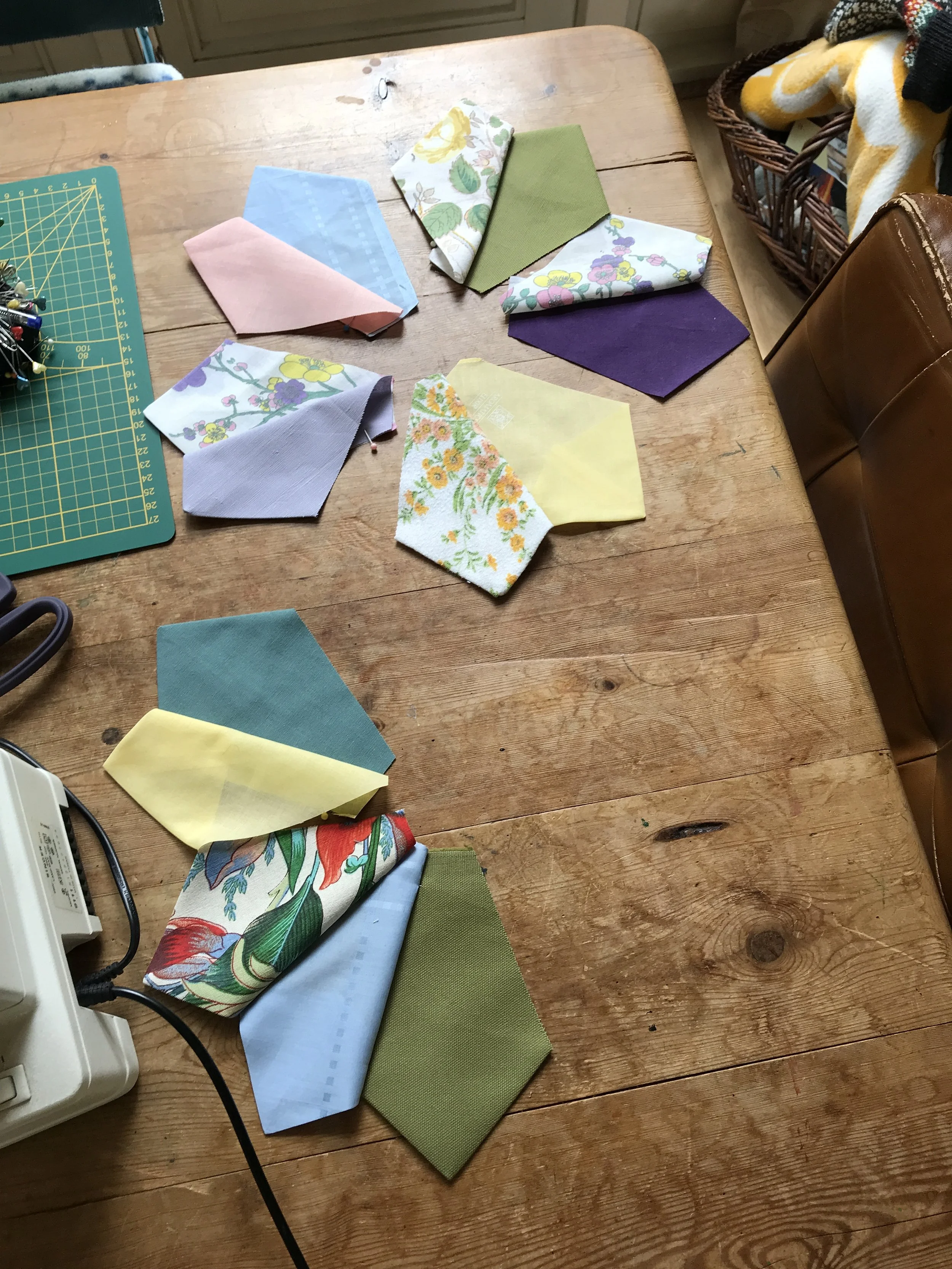 Een basis van ongebleekt katoen met daarop tientallen zakdoekjes, theedoeken en stukjes vintage dekbedovertrek.