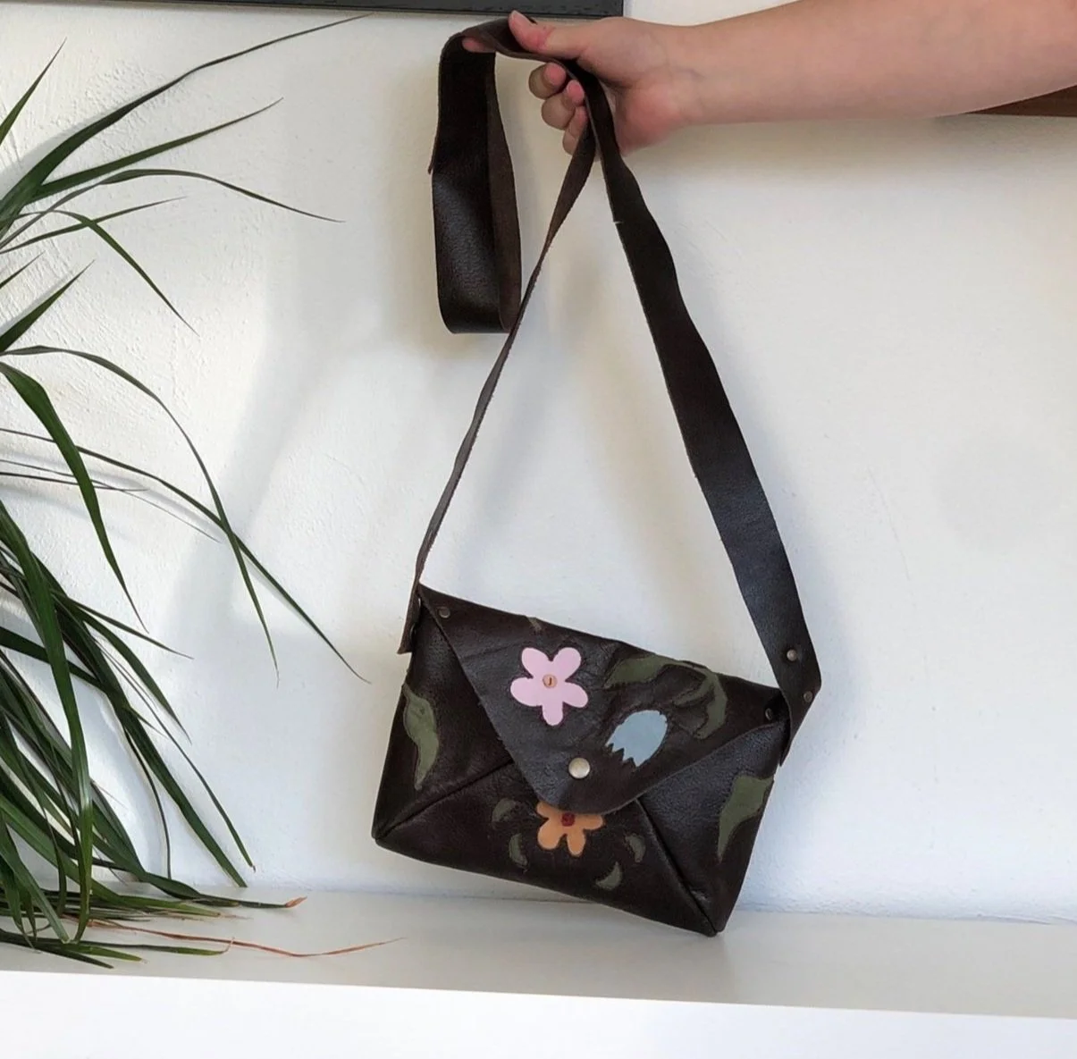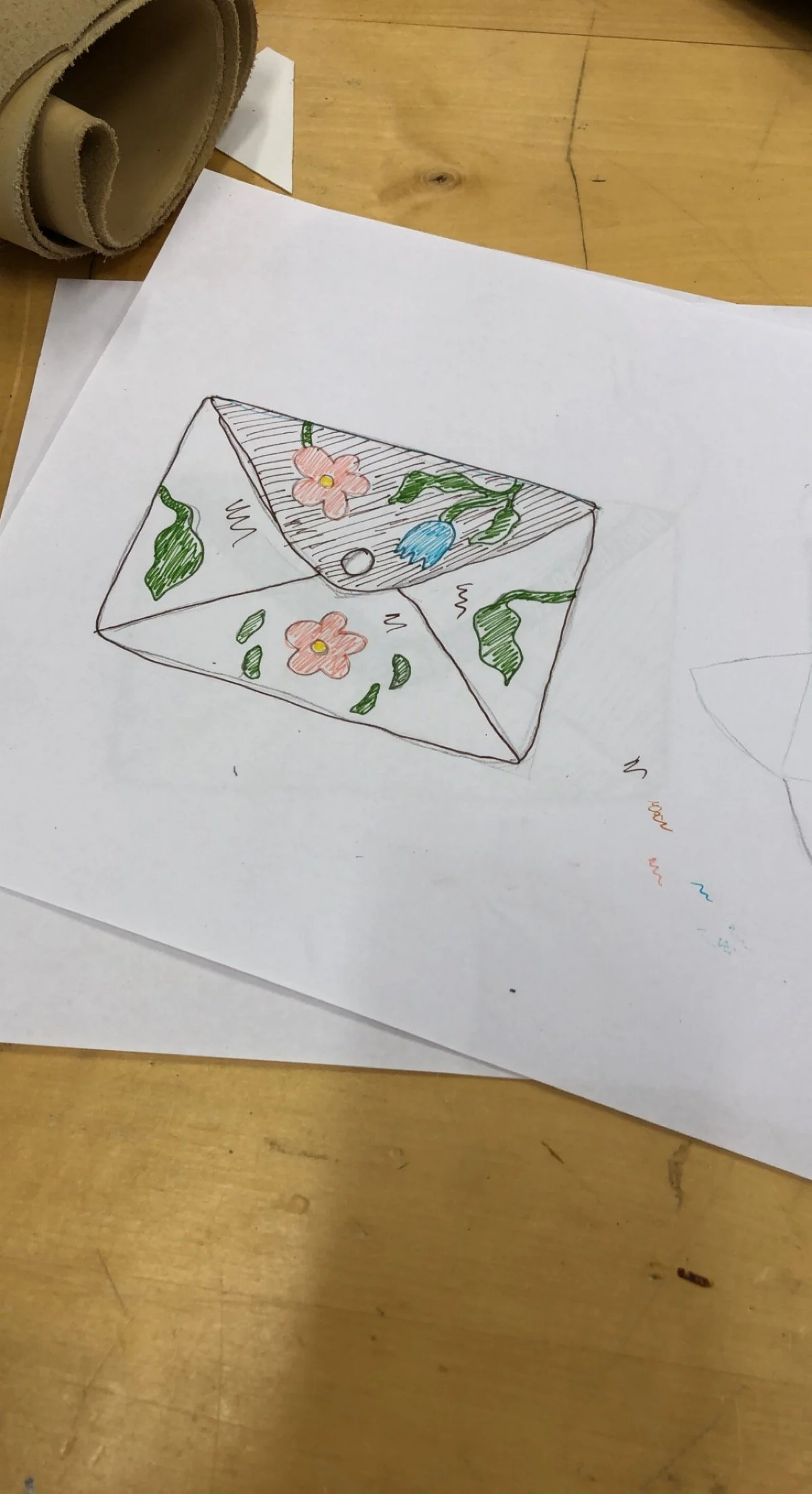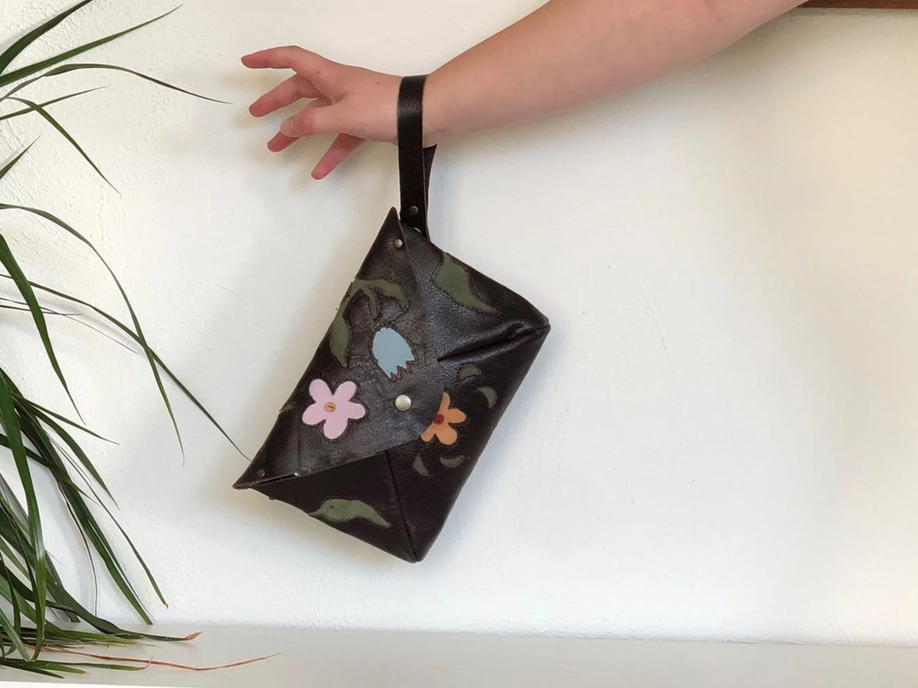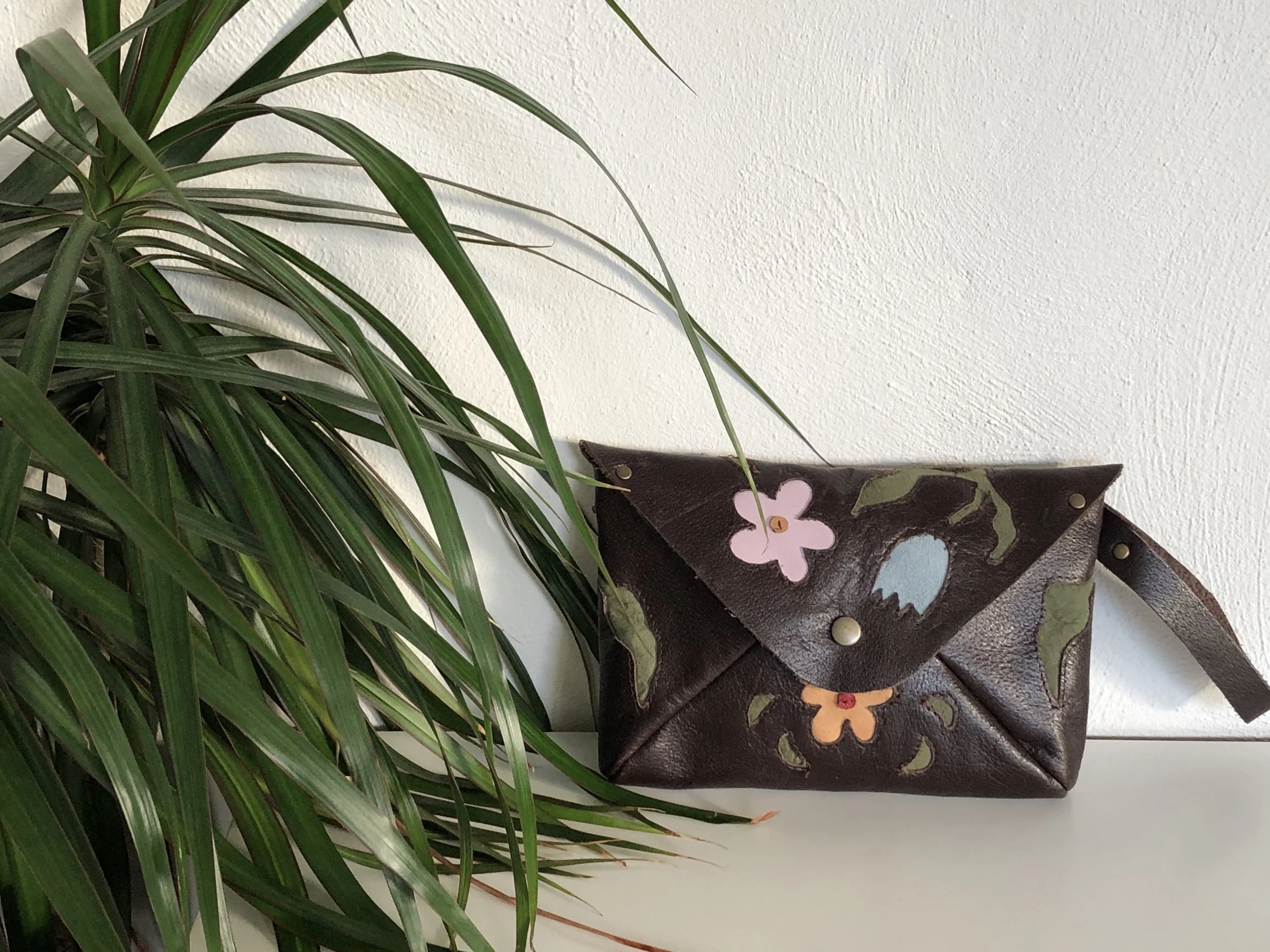 Bij deze clutch met botanisch inlegwerk was het een uitdaging om van schets naar product te gaan binnen één dag. Door het kiezen van een eenvoudig envelop patroon en door de achterkant van de clutch blanco te houden, is het gelukt.