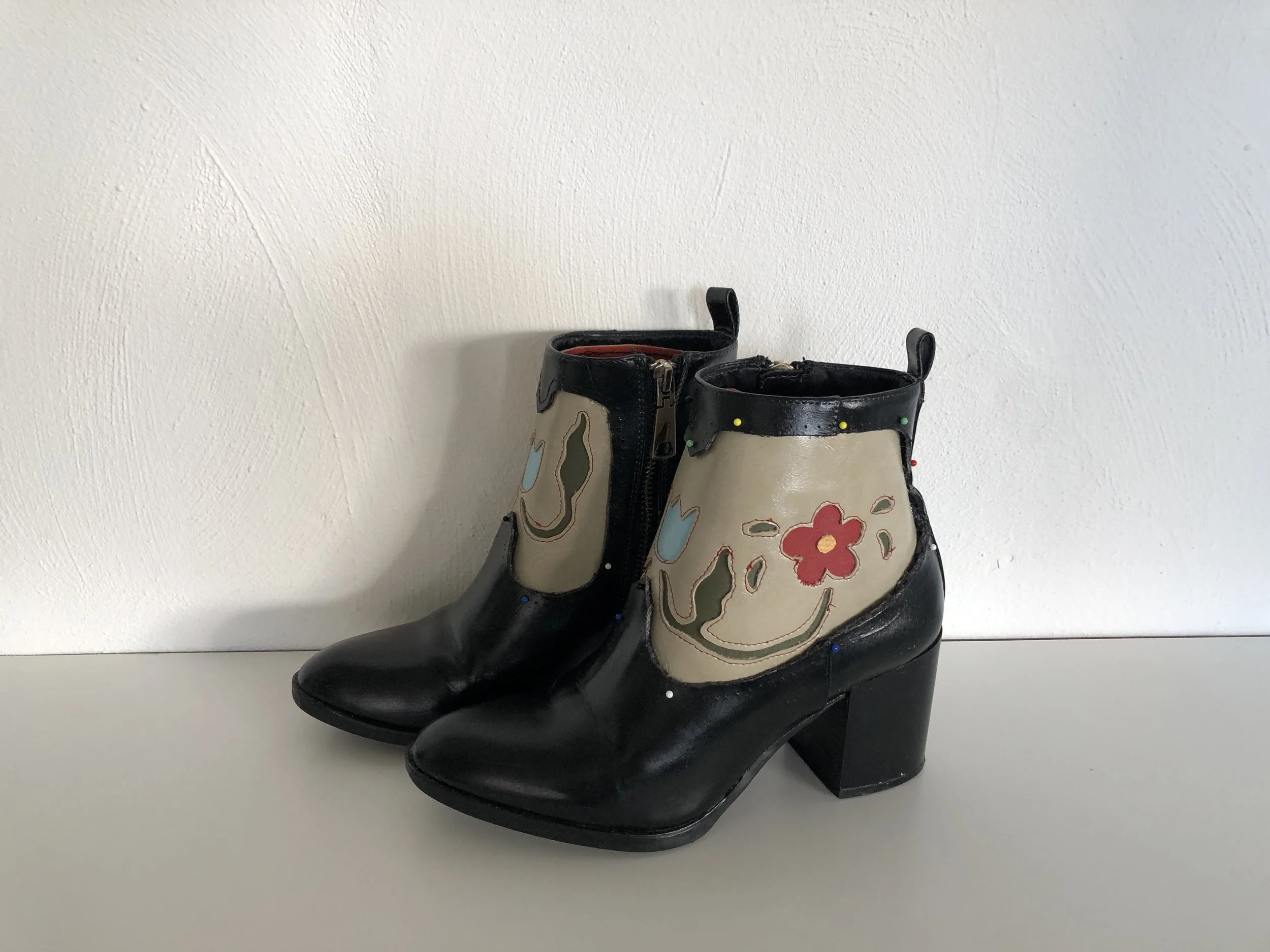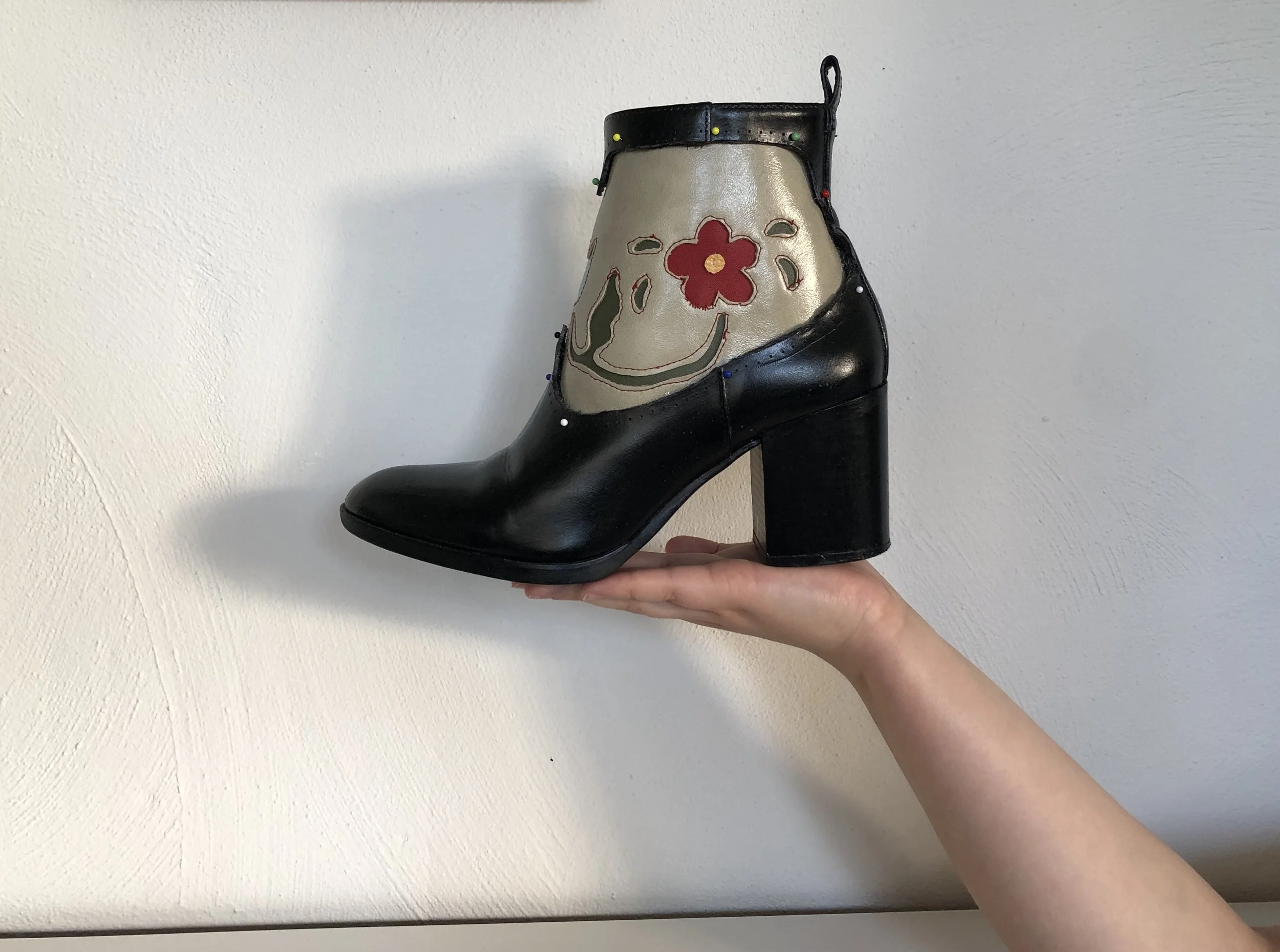 In dit concept-ontwerp heb ik de stijl van de traditionele cowboy boot gemoderniseerd en vervolgens gecombineerd met een bekendere vorm schoen; een elegant enkellaarsje met middelhoge hak. Daarnaast heb ik gelet op gebruik van duurzame materialen, het inlegwerk is gemaakt van reststukken skai leer van een meubelfabrikant.